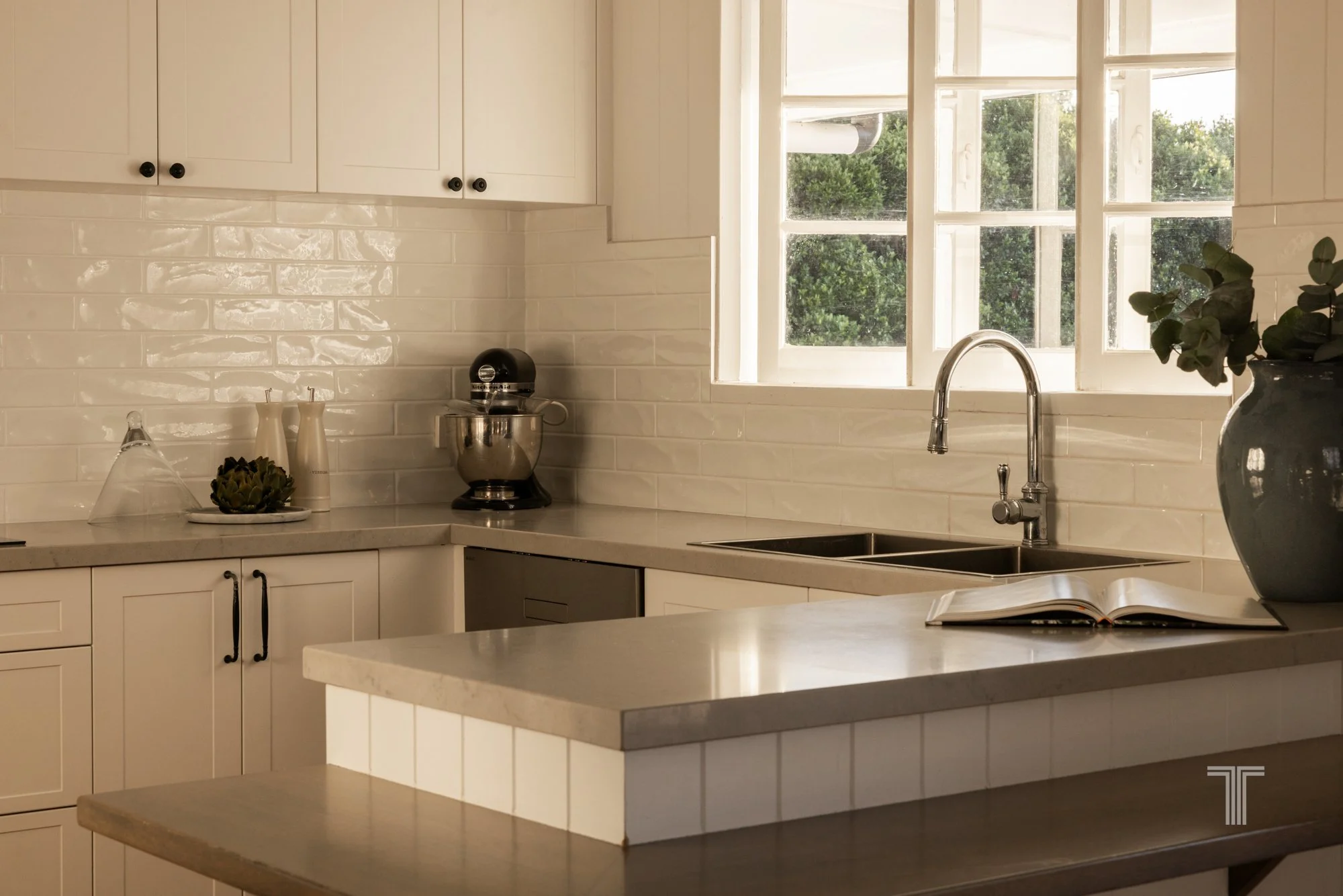 Noble Grey Caesarstone benchtops paired with soft-close cabinetry and a walk-in pantry